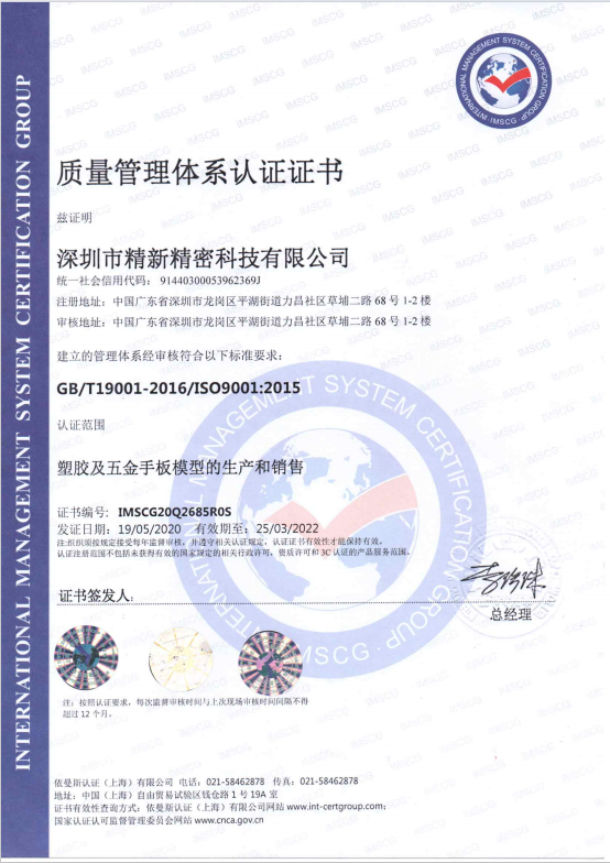 深圳市精新精密科技有限公司成立于1995年,位于中国深圳龙岗区平湖镇,具有二十多年的历史,国家高新企业,国家专精特新企业,2005年通过ISO9001质量体系认证,专业技术国内领先的大型手板模型企业,二百多名熟练的专业技师,为客户提供塑胶五金钣金手板模型制作、五金铝合金精密零件加工及小批量复制件生产,治具夹具制造,模具制造,产品研发设计,产品抄数,喷油,丝印等一站式全方位的先进技术服务。公司拥有一批国际最先进的现代化快速成型设备,88台大型CNC高速加工中心,3台五轴CNC加工中心,12台SLA快速成型、1台SLS激光粉末烧结快速成型,1台光学拍照式激光扫描仪,1台光学测数仪,1台三次元测数仪,3台CNC自动车床,另拥有钣金数控折弯机,全自动真空复模机,低压灌注复模设备,激光镭雕,高光切斜边和CD纹设备,无尘喷油丝印车间等。涉及智能机器人,无人机,汽车整车和零配件,家用电器,医疗器械,健康运动器材,玩具,通信设备、IT消费电子、智能安防、仪器仪表、玩具礼品、照明设备、家居家电、机械设备零部件等领域。对各种外观的工新艺处理和特殊新材料有20多年丰富的专业经验。